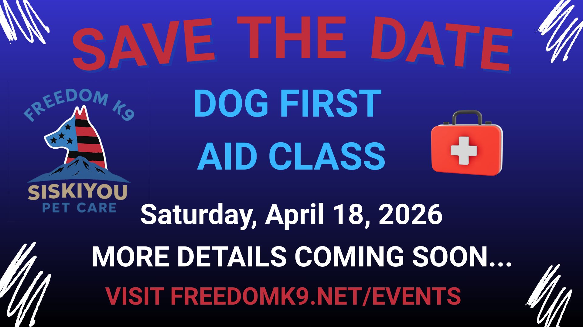 April 18 @ 8:00 am - 5:00 pm Dog First Aid Course Covenant Chapel 200 Greenhorn Road, Yreka, CA, United States